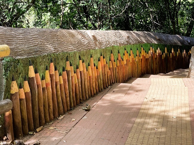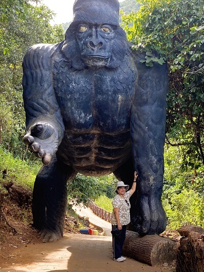 A lot of work has been to make it convenient for the tourists to visit this waterfall. There is a good parking lot for quite a few cars, adjacent to the ticket counter and the main entrance. You have to climb up a long winding flight of steps, flanked on both sides by shapes of large ‘color pencils’. In between you will be passing under a huge statue of a gorilla !! In some places the steps are quite steep, and we were huffing and puffing by the time we reached the viewpoint – a good workout.