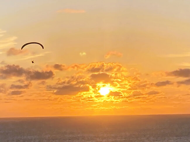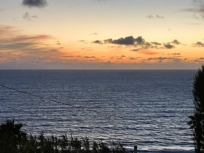 We were lucky in our choice of accommodation. We had an unrestricted view of the sea from the deck of our apartment, with the added bonus of watching paragliders floating far above the water. Besides, very close by we found an easy walking path leading to the steps that went down to the beach, where we saw the huge ‘dinosaur footsteps’ on the vertical rocks of the cliffs.