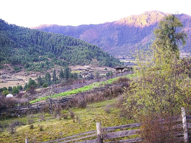 Phobjikha Valley, a part of the Gangtey valley, is at an altitude of about 3000 m. It has a beautiful landscape and is surrounded by verdant forests, rolling hills and pretty villages.