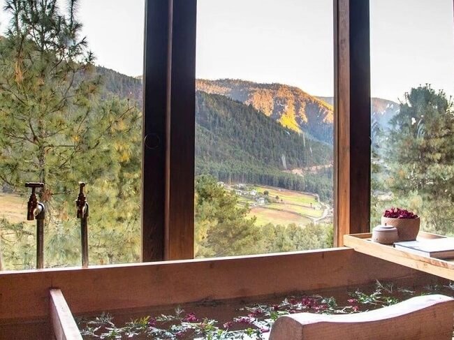 A Dotsho stone bath involves soaking in a wooden tub filled with water. River stones are first heated in a fire and then put in the water to make it slightly warm. The tubs are made from oak and local medicinal herbs and plants like Artemesia leaves are put in the tubs to relieve joint pains. The tubs are usually placed next to tall windows so that you can enjoy views of the valley during the bath. The aim is to calm the mind and promote relaxation.